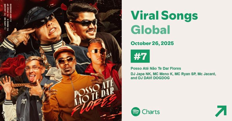 O funk brasileiro acaba de conquistar mais um feito histórico. A música “Posso Até Não Te Dar Flores”, parceria entre MC Ryan SP, MC Meno K, MC Jacaré, DJ Japa NK (artista contratado da KondZilla Nova Era) e DJ Davi DogDog, acaba de se tornar a primeira faixa totalmente em português a ocupar o ranking das 10 mais ouvidas do Spotify Global, um marco inédito que consolida o poder da música urbana nacional e reforça a força criativa que emerge das periferias do Brasil para o mundo.