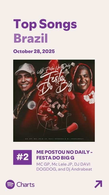 Antes mesmo de completar um mês do lançamento oficial, “Me Postou no Daily – Festa do Big G”, parceria de MC GP, MC Lele JP, DJ Davi DogDog e DJ Andrabeat, alcançou um feito histórico: o Top 2 do Spotify Brasil.